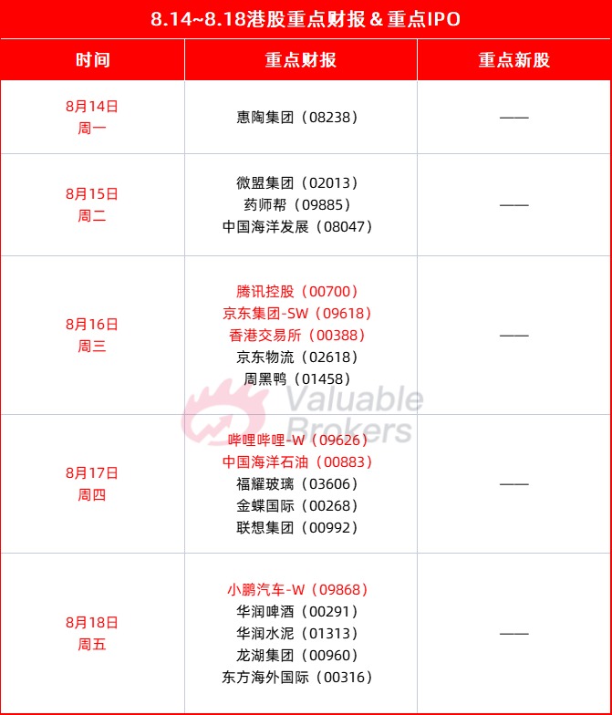 下周港股有较多重磅财报陆续公布,周三重点关注腾讯控股、京东集团-SW、香港交易所;周四关注哔哩哔哩-W、中国海洋石油;周五关注小鹏汽车-W等。