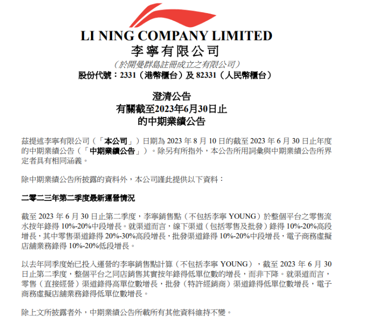 李宁在港交所公告称,上半年收入140.19亿元人民币,同比增长13.0%。上半年净利润21.2亿元人民币,市场预期为22.2亿元。经营现金流19.42亿美元,同比增长22.7%。公司毛利率为48.8%,净利润率为15.1%。公司每股中期派息0.362元人民币。