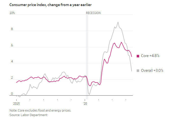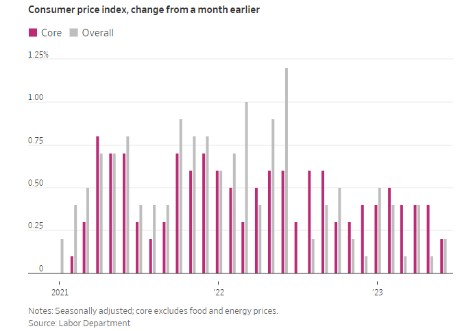 接受《华尔街日报》调查的经济学家预计,7月份CPI环比将上涨0.2%,与6月份持平,表明物价压力保持稳定。据预测,这意味着7月份的通胀年率将攀升至3.3%左右,高于6月份的3%,这是两年多来的最低水平。不过经济学家表示,这一增长可能与2022年6月和7月发生的情况有很大关系,受到基数效应的影响。