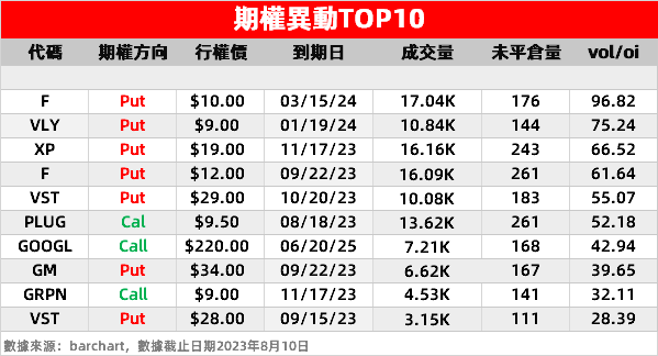 1、福特汽车:股价隔夜跌超4%,全美汽车工人联合会呼吁增加工资和福利,市场担忧传统汽车制造商的劳动力成本飙升。期权投资者隔夜涌入该股行权价10美元、2024年3月15日到期和行权价12美元、2023年9月22日到期的PUT单,押注福特股价进一步下行。