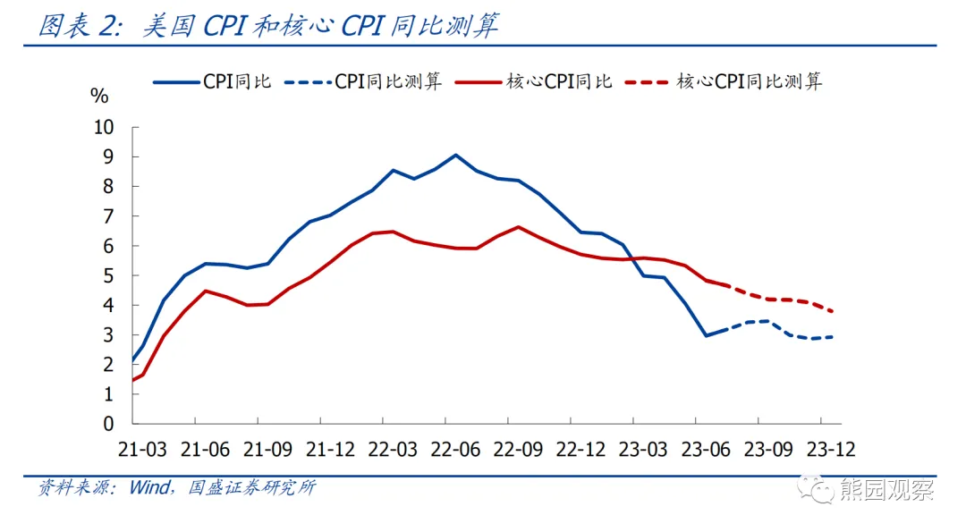 2、根据我们测算,8月美国CPI、核心CPI同比分别为3.4%、4.4%左右;年底时CPI、核心CPI同比分别在3.0%、3.8%左右。从走势看,CPI同比将在三季度小幅反弹、四季度重新回落;核心CPI同比将基本保持匀速缓慢下行。