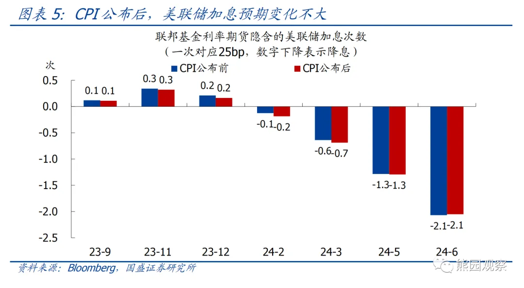 >加息预期变化:利率期货数据显示,CPI数据公布后,市场对后续加息和降息的预期基本没有变化。目前市场依然预期后续再加息的概率仅为30%左右,如果再加息将会在11月;年内大概率不降息,明年2月降息概率约50%,3月降息概率为100%。