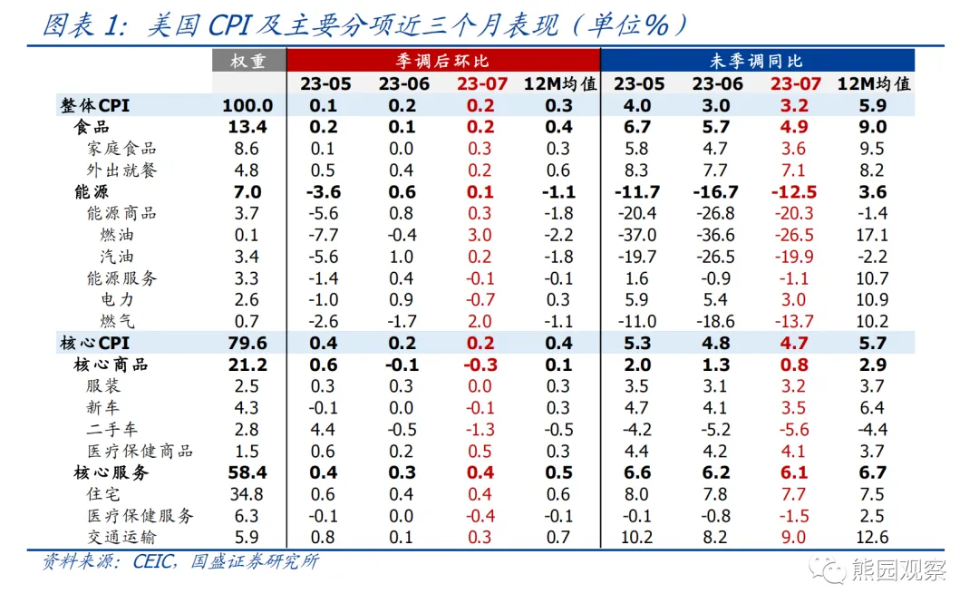 >整体表现:美国7月未季调CPI同比3.2%,预期3.3%,前值3.0%;核心CPI同比4.7%,预期4.8%,前值4.8%,是2021年11月以来最低;整体CPI同比已连续5个月低于核心CPI同比。季调后的CPI环比、核心CPI环比均为0.2%,均与预期和前值持平,其中核心CPI环比已连续2个月与2000年以来的季节性均值持平,反映出美国通胀环比涨幅已基本回归正常节奏,随着时间推移同比也将逐渐回归正常水平。
