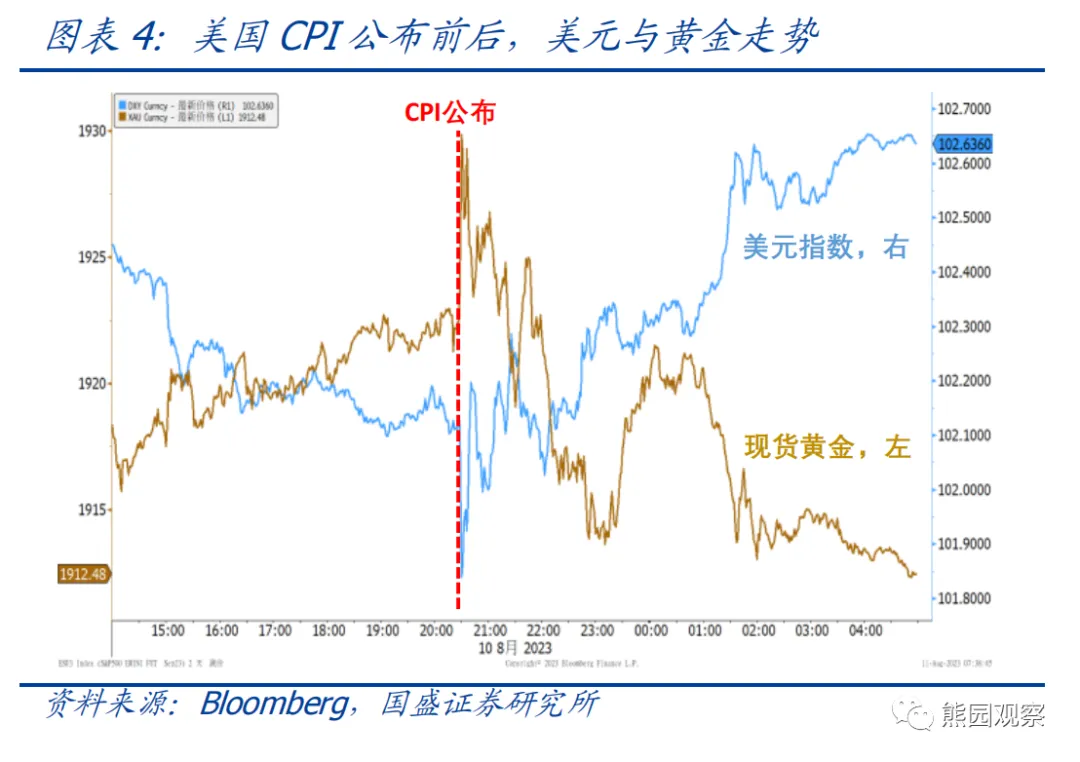 >大类资产表现:CPI公布后,美股和黄金先涨后跌,10Y美债收益率和美元指数持续上行。截至8/11凌晨收盘,标普500指数持平,纳斯达克、道琼斯指数分别上涨0.1%、0.2%,10Y美债收益率上行10bp至4.11%,美元指数上涨0.1%至102.6,现货黄金下跌0.1%至1912.1美元/盎司。