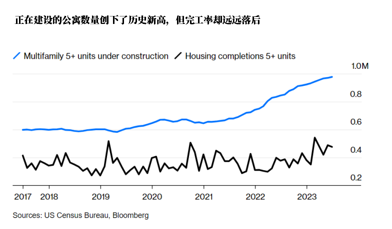 然而,有两个重要的注意事项需要考虑。首先,尽管通胀有所放缓,但从食品、汽车到住房等商品价格仍然居高不下。全国房地产经纪人协会周四表示,截至6月30日,其季度购房者负担能力指数跌至历史新低。其次,对未来租金将下降的预期在很大程度上是由更多的供应上线推动的。多户住宅开工量较疫情前的约60万套猛增至近100万套,创历史新高。但实际完工进度远远落后,可能是因为开发商认为借贷成本太高,完成项目无法盈利。
