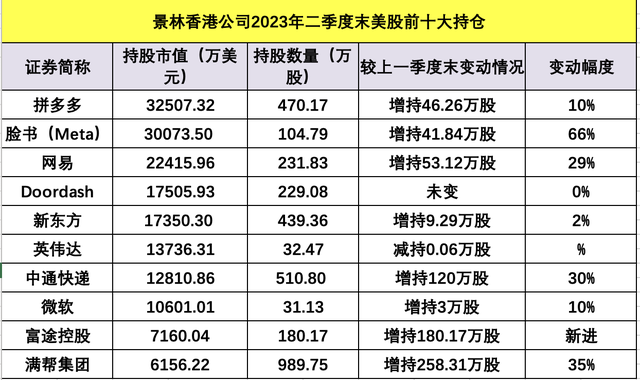 此外,景林资产还加仓了网易53.12万股,二季度末的持股数量增至231.83万股,持有总市值达到2.24亿美元,成为第三大重仓股。