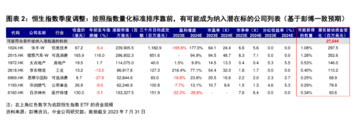 基于现有可得公开数据,该行估算快手-W、理想汽车-W、太古地产、京东物流、思摩尔国际、华润燃气、百济神州等排在恒生指数顺位前列,有可能成为被纳入的潜在候选者。