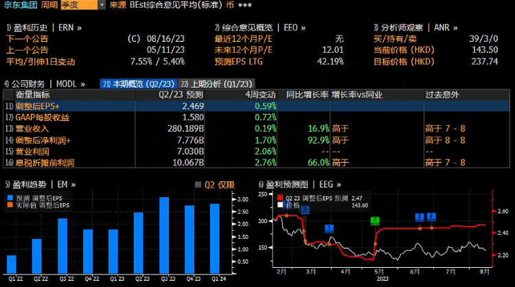 京东集团-SW( $09618.HK / $JD )将于8月16日发布2023年第二季度财报。根据彭博一致预期,京东二季度营收为2802亿元人民币,同比增长17%;调整后净利润为77.76亿元,调整后EPS 2.47元。