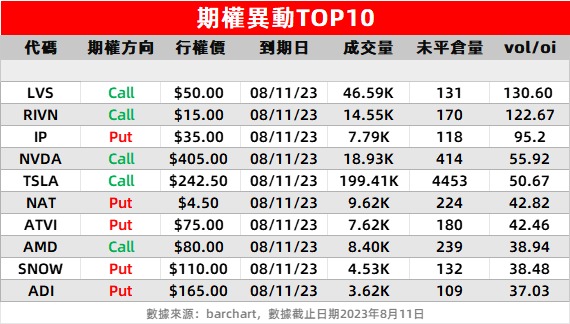 1、拉斯维加斯金沙集团 $LVS 周五出现大量看涨期权单押注,其中行权价为50美元,到期日8月11日的看涨期权,上周五成交超4.6万张。该公司此前披露的业绩显示,2023财年第二财季实现净利润3.12亿美元,同比增加208.71%。