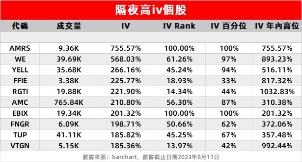 2、美国卡车公司Yellow $YELL 上周五表示,将破产贷款谈判延长至本周,寻求探讨至少两个替代贷款方案,为公司提供1.425亿美元的新现金。其期权的隐含波动率晋升至IV个股榜前三。