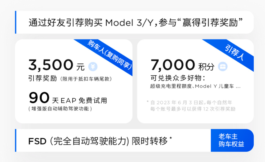 不过这次特斯拉特别注明,从今年6月3日起,每个自然年每个账号最多可以获得 12次引荐奖励。