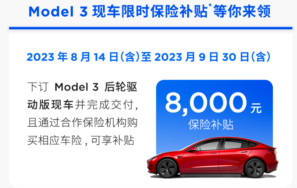 当然,Model 3也没闲着,给出了现车 8000元的限时保险补贴。