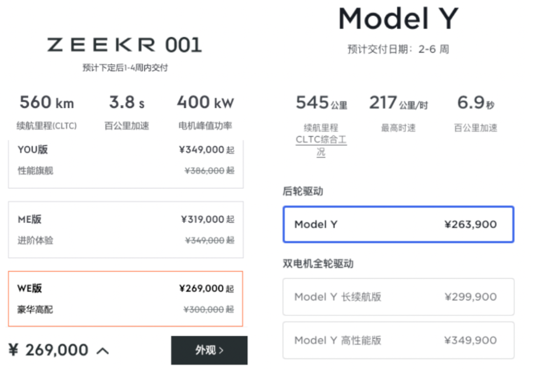 这一轮降价后,极氪001的三款车型售价已经和今天宣布降价的Model Y重合。