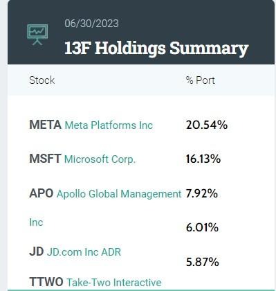 在前五大重仓股中,重仓Meta Platforms(META.US)(持股市值24.6亿美元,占投资组合比例为20.54%)、微软(MSFT.US)(19.3亿美元,16.13%)、阿波罗(APO.US)(9.479亿美元,7.92%)、京东(JD.US)(7.193亿美元,6.01%)、Take-Two互动软件(TTWO.US)。