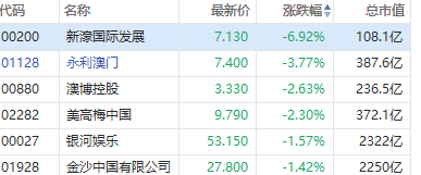 博彩股普跌,截至发稿,新濠国际发展跌近7%,永利澳门跌近4%,澳博控股、美高梅中国跌超2%,银河娱乐、金沙中国有限公司跌超1%。
