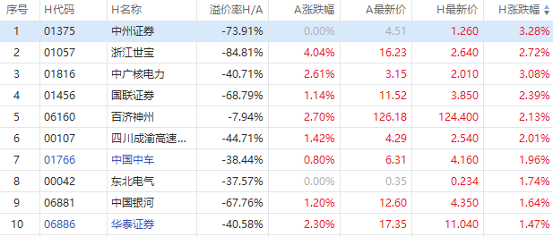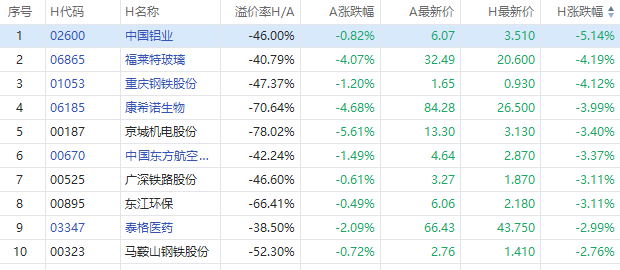 中国铝业A股跌0.82%,H股现跌超5%;福莱特玻璃A股跌4.07%,H股现跌4.19%;重庆钢铁股份A股跌1.2%,H股现跌4.12%。
