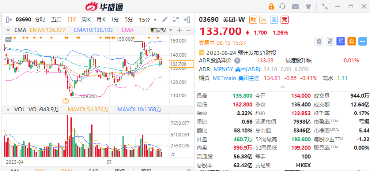正股表现:美团-W由上周五失守140港元水平,昨日跌约1.3%,今日继续下跌,早上至今在133至136港元间上落。目前为连续第3日下跌。有券商料内地科技板块下半年收入增长仍将延续上半年强劲趋势,维持对其正面看法,并将美团列为首选股之一。