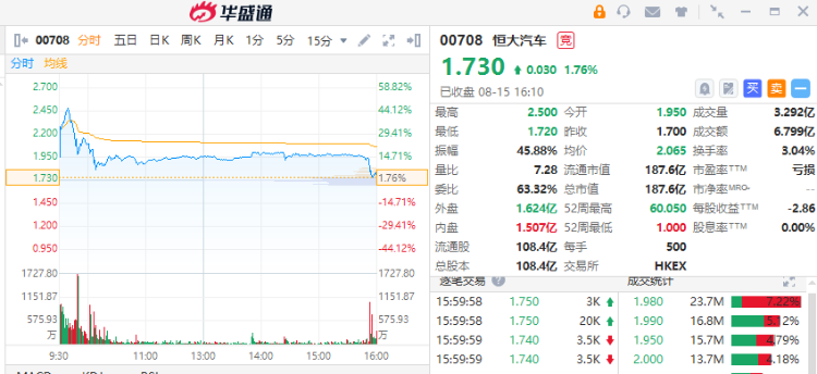 盘面上,大型科技股全线下挫,京东、快手、美团、阿里跌幅均逾1%;内房股全线下挫,新城发展跌3%领衔;新能源汽车延续昨日跌势,蔚来跌超2%,比亚迪、理想跟跌,恒大汽车早间一度涨超45%,截至收盘涨幅收窄至1.76%。