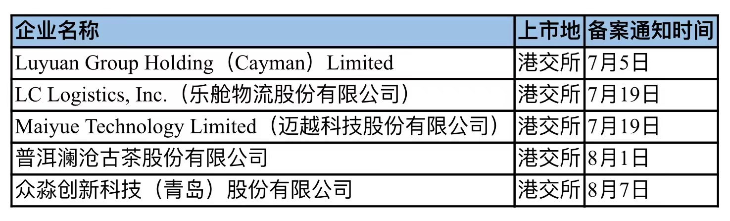 拟上市港交所的5家企业分别是Luyuan Group Holding(Cayman)Limited(绿源集团控股(开曼)有限公司)、LC Logistics, Inc.(乐舱物流股份有限公司)、Maiyue Technology Limited(迈越科技股份有限公司)、普洱澜沧古茶股份有限公司、众淼创新科技(青岛)股份有限公司。