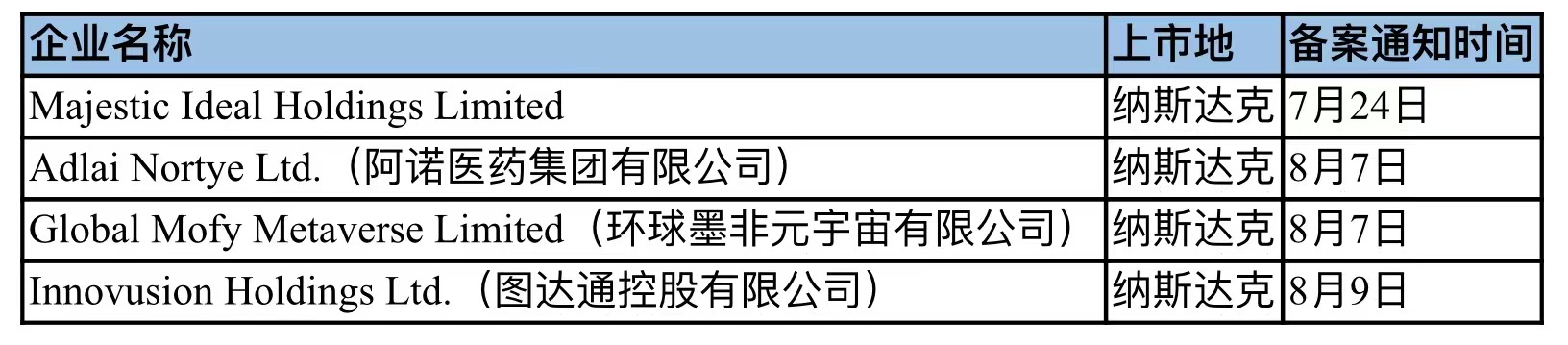 拟上市纳斯达克的4家企业包括Majestic Ideal Holdings Limited(上海新骏羊绒服饰有限公司)、Adlai Nortye Ltd.(阿诺医药集团有限公司)、Global Mofy Metaverse Limited(环球墨非元宇宙有限公司)、Innovusion Holdings Ltd.(图达通控股有限公司)。