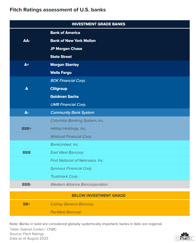 据CNBC报道,Chris Wolfe表示,若惠誉再将银行业评级从AA降至A+,将迫使惠誉重新评估对 70 多家美国银行的评级。