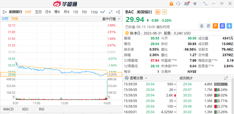受消息影响,隔夜美国银行股集体走低。阿莱恩斯西部银行收跌逾4%,西太平洋银行跌近4%,美国银行跌超3%,第一银行跌近3%;区域银行指数ETF收跌3.33%。
