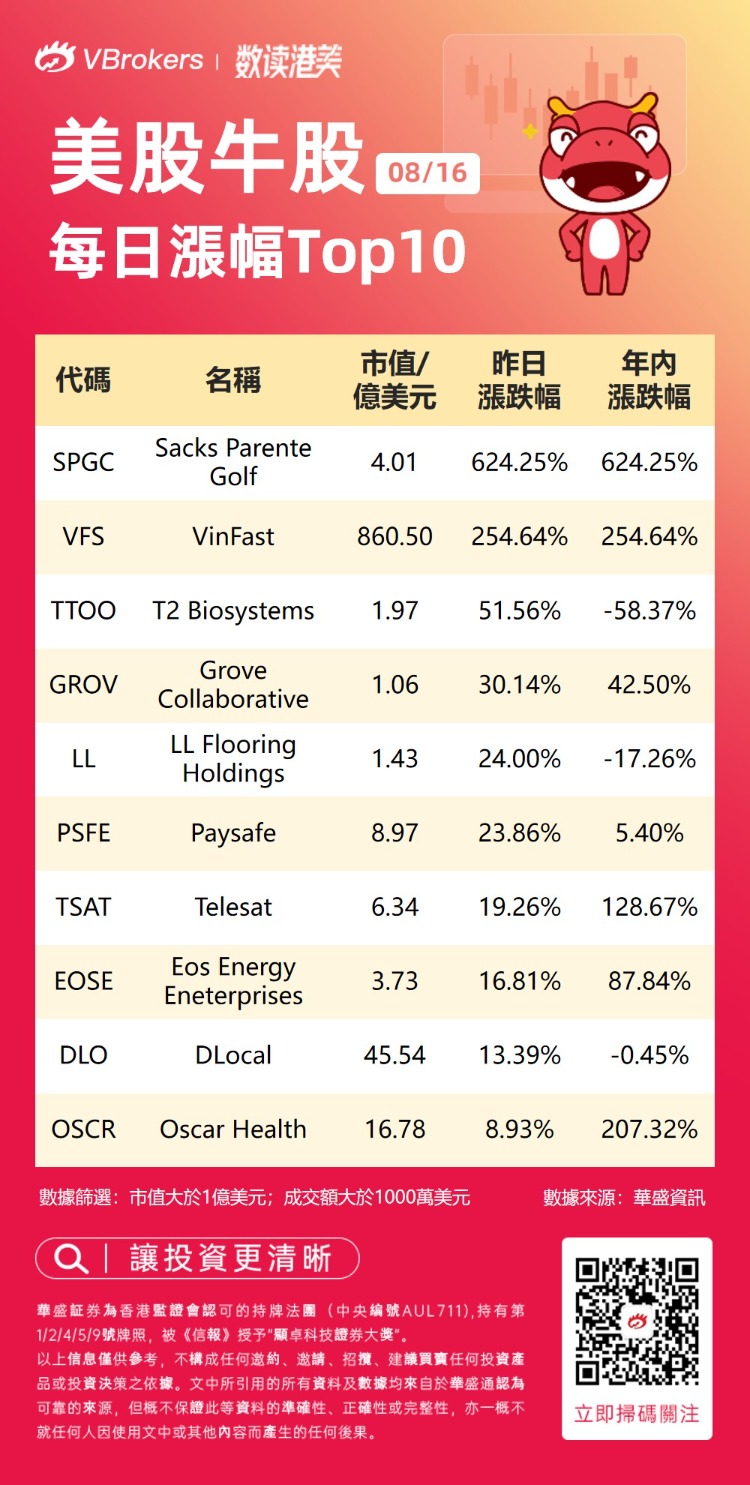 华盛资讯8月16日,隔夜美股三大指数收盘均跌逾1%,标普500指数跌1.16%至五周新低,纳指跌1.14%,道指跌1.02%。尽管大盘表现不佳,但美股新股却是气势如虹,發仔梳理了每日美股涨幅Top10榜单,以下为今日美股涨幅靠前的个股: