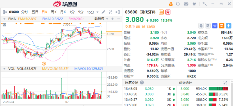 8月16日讯,现代牙科(03600)股价今日暴涨13.24% ,报3.08港元。消息面上,公司发布盈喜,预计6月止六个月纯利介乎2亿至2.2亿元,较2022年同期增长99.2%-119.1%;收益预计增加10.3%-17.3%。主要由于牙科行业数码化趋势推动数码化解决方案个案比例增加,推动营运效率提升。