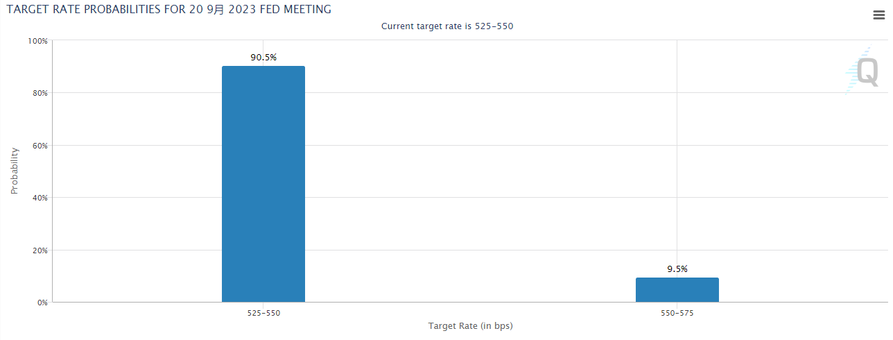 根据期货合约,投资者目前预计今年不会再加息。芝商所的美联储观察工具显示,美联储在9月份维持基准利率不变的可能性为90.5%,其在11月加息的可能性为31.7%。美联储观察人士将仔细剖析鲍威尔将在杰克逊霍尔研讨会上发出的信号。