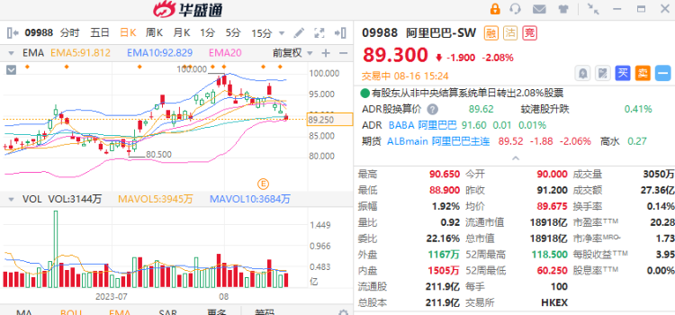 内地上日公布消费数据较预期弱,阿里巴巴(9988) 今早开市初段,阿里跌穿90港元关口。