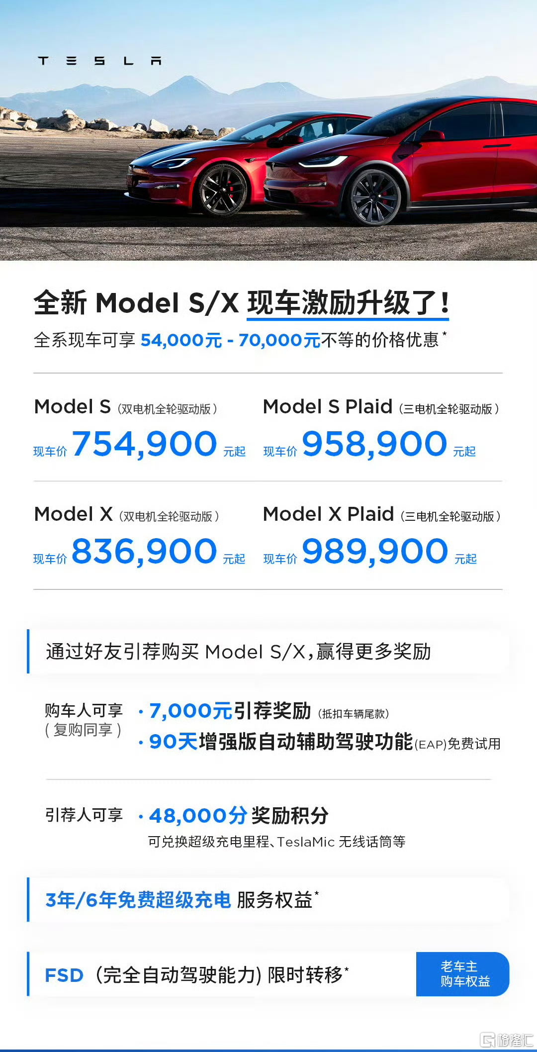 8月16日周三,特斯拉官微宣布,特斯拉中国 Model S / X 现车再降价,全系现车可享 54000 元-70000 元不等的价格优惠,Model S 现车 75.49 万元起售,原价 80.89 万元起;Model X 现车 83.69 万元起售,原价 89.89 万元起,还有 3 年 / 6 年免费超充、引荐奖励、FSD 限时转移等权益。