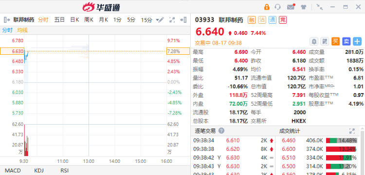 联邦制药发盈喜后高开,截至发稿,联邦制药涨超7%,报6.64港元,成交额1838万港元。