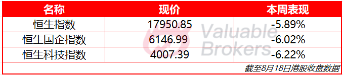恒生指数本周跌5.89%,报17950.89点;国企指数本周跌6.02%,报6146.99点;恒生科技指数本周跌6.22%,报4007.39点;