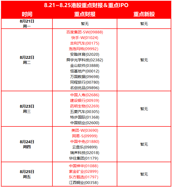 下周港股有较多重磅财报陆续公布,周二重点关注百度,快手、吉利汽车、泡泡玛特;周三关注中国人寿、建设银行、药明生物;周四关注美团-W、网易-S、中国中免等;周五关注东方甄选、中国神华、紫金矿业等。
