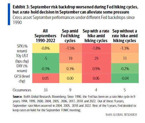 美国银行经济学家最近调整了对2023年美联储的利率预测,认为9月将维持利率不变,11月将再次加息。从1990年以来的实证结果来看,与美联储加息周期中通常出现的9月剧烈波动相比,市场趋于一致预期美联储9月按兵不动可能会在一定程度上缓解下个月市场的压力。然而,在9月利率保持不变后,随后的加息可能会导致11月市场波动加剧。今年6月美联储按兵不动和随后在7月加息的会后市场动态已经以这种方式上演。