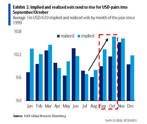 从历史上看,9月份一直是资本市场一年中波动最大的月份之一,外汇市场也不例外。如图所示,自1999年以来,隐含的和实际的外汇波动性都倾向于从8月开始上升,然后在10月达到峰值。所谓的“9月效应”在股票市场上众所周知,自1928年以来,标普指数下跌了56%。在宏观领域,一些投资者认为,7月和9月FOMC会议之间的时间间隔接近两个月,往往会让不确定性增加。在某种程度上,在美联储掌握了今年的大部分数据之后,市场也急于看到9月届时将公布的对当前和未来几年的经济预测摘要。