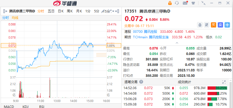 如投资者部署短线追入可参考腾讯购 $17351.HK ,行使价381港元,实际杠杆11.4倍,2023年11月3日到期。