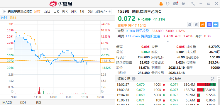 如看淡正股后市可参考腾讯沽 $15598.HK ,行使价288.68港元,实际杠杆8.4倍,2023年12月19日到期。