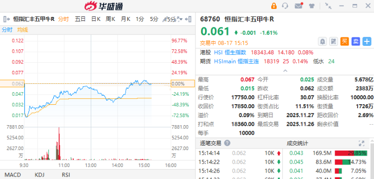 今早港股开市初段,恒指跌逾400点穿18,000点关口,其后触底反弹。投资者如看好恒指可留意牛证 $68760.HK ,收回价17,850点,2025年11月到期,实际杠杆37.2倍;