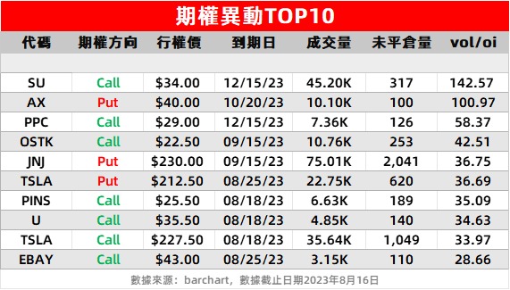 2、森科能源 $SU Q2获野村建仓,一笔行权价为34美元,到期日12月25日的看涨期权单成交量达4.5万张,远超过其未平仓数317张,V/OI值达142.57。