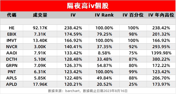 1、夏威夷电力实业 $HE 盘前急挫14%,据报道称,该公司正就重组工作进行谈判。隔夜期权成交量狂飙至9万张,其隐含波动率蹿升至238.42%,创年内新高。值得留意的是,标普全球将夏威夷电力的评级下调至“BB-”,并将该公司列入评级进一步下调的观察名单。