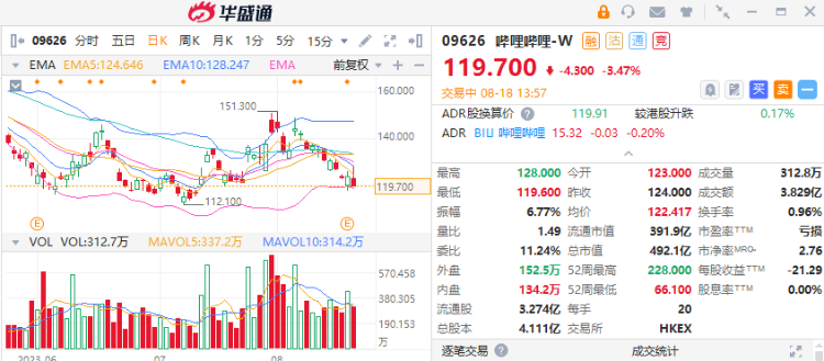 华盛资讯8月18日讯,哔哩哔哩-W昨日收市后公布第二季业绩,今日股价持续,最新报1119.70元跌3.47%。