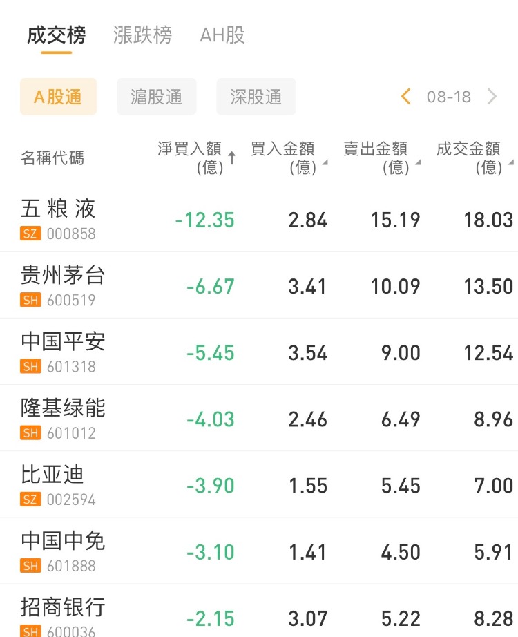 北向资金今日大幅净卖出85.22亿元。五粮液、贵州茅台、中国平安分别获净卖出12.35亿元、6.67亿元、5.45亿元。广联达净买入额居首,金额为4.07亿元。