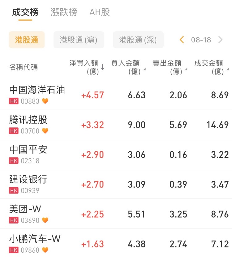 中国海洋石油、腾讯控股、中国平安、建设银行分别获净买入4.57亿港元、3.32亿港元、2.9亿港元、2.7亿港元;盈富基金遭沽出48.9亿港元,抛售恒生中国企业28.4亿港元。注:北水昨日加仓腾讯11.97亿港元。