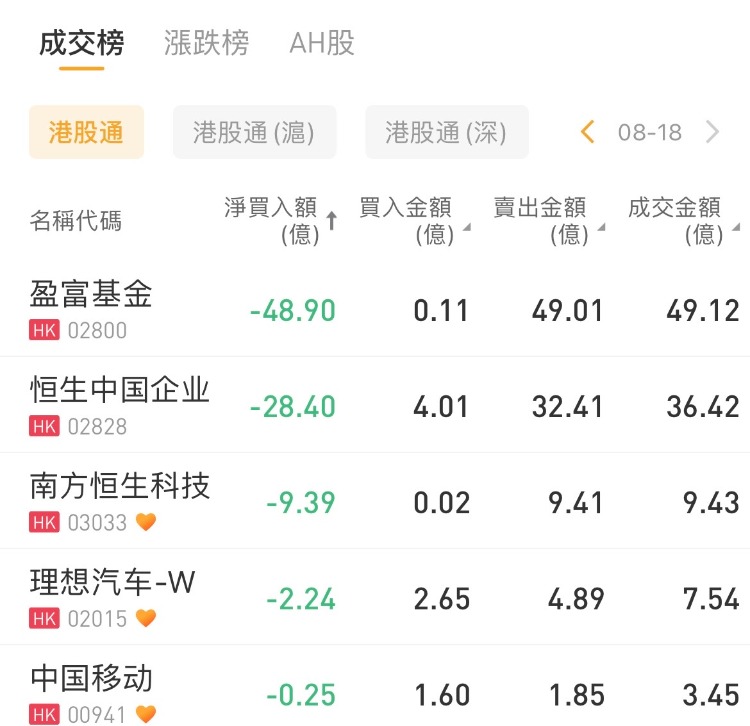 华盛资讯8月18日讯,南下资金今日净卖出港股40.91亿港元,其中港股通(沪)净买入7.84亿港元,港股通(深)净卖出48.75亿港元。