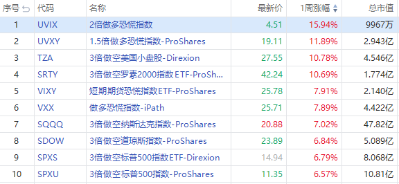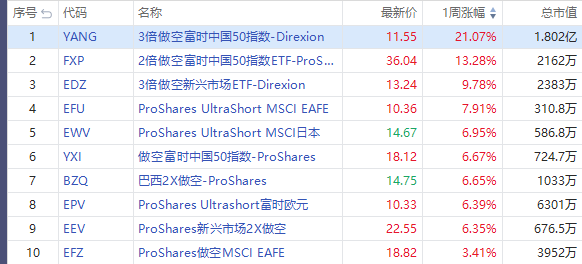 另外,本周做空指数ETF均位居榜上前列。其中,3倍做空美国小盘股ETF $TZA 涨10.78%;3倍做空罗素2000指数ETF $SRTY 涨10.69%;大盘股指数ETF方面,3倍做空纳斯达克指数ETF $SQQQ 周涨7.02%;3倍做空道琼斯指数ETF $SDOW 周涨6.84%;3倍做空标普500指数ETF $SPXS 也录得6.79%涨幅。