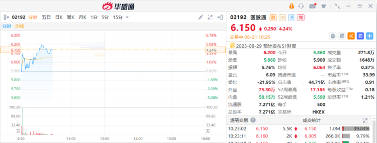 8月21日,港股医脉通涨4.24%,报6.15港元,成交额1648万港元。