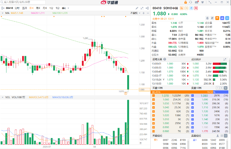 受此消息影响,SOHO中国股价周一(8月21日)早盘走低,股价一度跌超7%。