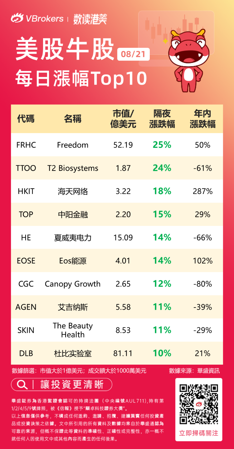 华盛资讯8月21日讯,美股三大指数上周集体回调,标普500、纳指已录得三周连跌,市场继续关注财报与美联储政策前景。投资者寻求小盘股做多机会,發仔梳理了每日美股涨幅Top10榜单,以下为隔夜美股涨幅靠前的个股: