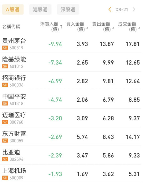 北上资金今日净卖出A股64.12亿元,为连续第11日净卖出,共计611亿元。贵州茅台、隆基绿能、招商银行分别获净卖出9.94亿元、7.34亿元、6.99亿元。华泰证券净买入额居首,金额为5.34亿元。